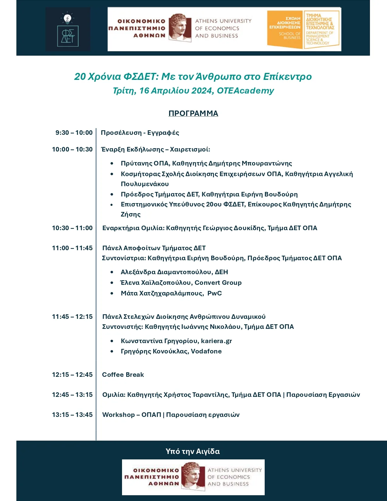Υπό την αιγίδα του Οικονομικού Πανεπιστημίου Αθηνών πραγματοποιείται το 20ό Επετειακό Φοιτητικό Συνέδριο του ΔΕΤ (ΦΣΔΕΤ), με θέμα «20 χρόνια ΦΣΔΕΤ: Με τον άνθρωπο στο επίκεντρο», την Τρίτη 16 Απριλίου, στο ΟΤΕAcademy (Πέλικα και Σπάρτης 1, Μαρούσι).