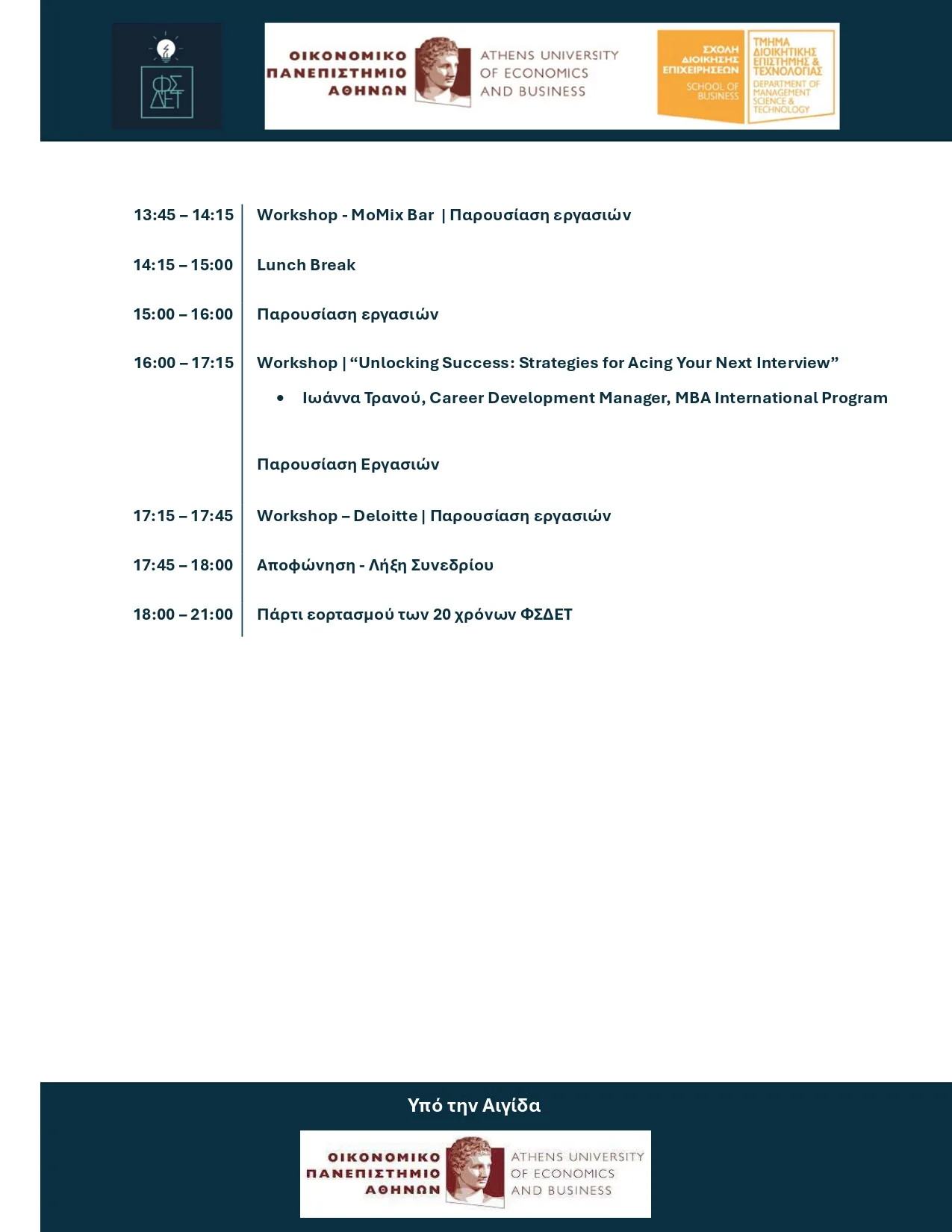 Ταυτόχρονα, οι συμμετέχοντες και οι συμμετέχουσες θα έχουν την ευκαιρία να λάβουν μέρος σε ενδιαφέροντα workshops, όπως το «Unlocking Success: Strategies for Acing Your Next Interview» από την κυρία Ιωάννα Τρανού, Career Development Manager στο ΜΠΣ MBA International του ΟΠΑ.