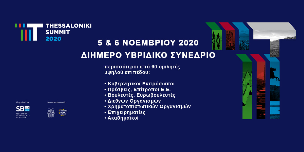Εξ ολοκλήρου διαδικτυακά θα διεξαχθεί τελικά το Thessaloniki Summit 2020, το διήμερο 5-6 Νοεμβρίου. Όπως ανακοίνωσε στις 2 Νοεμβρίου ο Σύνδεσμος Βιομηχανιών Ελλάδος (ΣΒΕ) που διοργανώνει τη λεγόμενη “Σύνοδο της Θεσσαλονίκης” σε συνεργασία με το Οικονομικό Φόρουμ των Δελφών και με την υποστήριξη του Enterprise Europe Network Hellas, η απόφαση αυτή έρχεται σε συνέχεια των πρόσφατων εξελίξεων όσον αφορά την αύξηση των κρουσμάτων της Covid-19 στην πόλη και σε συμμόρφωση προς τα υγειονομικά πρωτόκολλα.