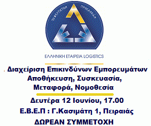 Η Ελληνική Εταιρεία Logistics τιμώντας τον ενημερωτικό της ρόλο και δίνοντας βαρύτητα στον τομέα της πρόληψης, διοργανώνει την εσπερίδα «Διαχείριση Επικίνδυνων Εμπορευμάτων: Αποθήκευση, Συσκευασία, Μεταφορά, Νομοθεσία», τη Δευτέρα 12 Ιουνίου 2017, από τις 17.00-20.30, στο Εμπορικό και Βιομηχανικό Επιμελητήριο Πειραιά.