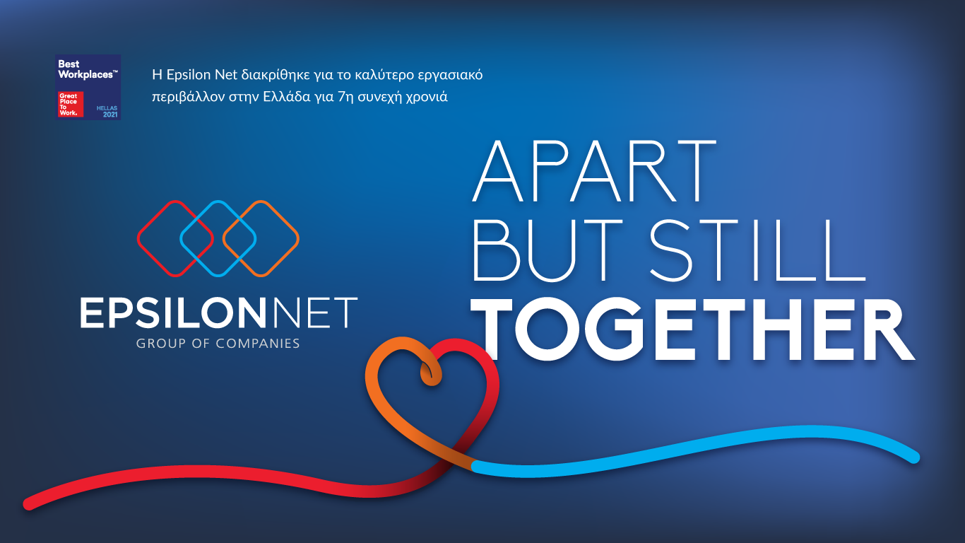 Για 7η συνεχόμενη χρονιά ο Όμιλος Epsilon Net αναδείχθηκε ανάμεσα στις εταιρείες με το καλύτερο εργασιακό περιβάλλον στην Ελλάδα από το διεθνώς αναγνωρισμένο οργανισμό Great Place to Work, κατακτώντας την 4η θέση. Με σύνθημα #apartbutstilltogether, ο Όμιλος διακρίθηκε στην κατηγορία των εταιρειών που απασχολούν πάνω από 250 εργαζόμενους.