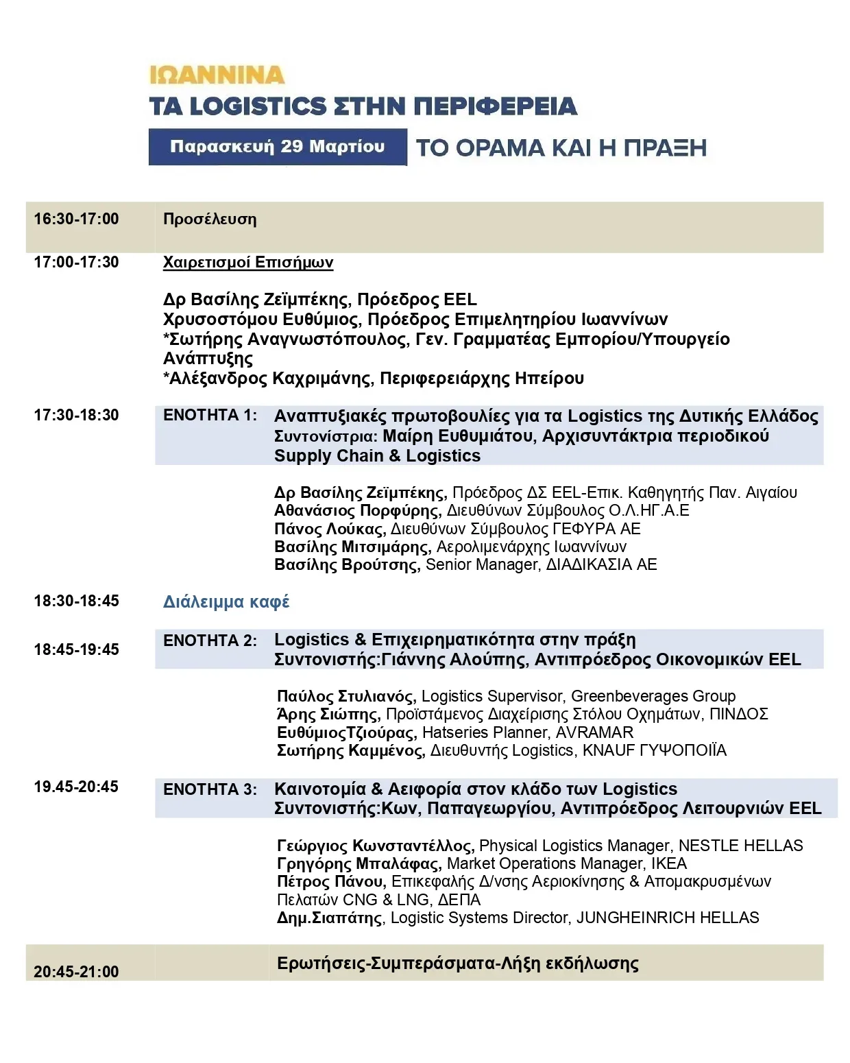 Όπως αναφέρεται από την EEL, η εσπερίδα «Ιωάννινα – Τα Logistics στην περιφέρεια: Το Όραμα και η Πράξη» αποτελεί σημαντικό γεγονός για την ενημέρωση του επιχειρηματικού κόσμου και είναι η δεύτερη φορά που διοργανώνεται στην πόλη των Ιωαννίνων. Αποτελεί δε, τη συνέχεια της σειράς δράσεων Road Show που έχει ήδη πραγματοποιήσει η EEL στα Τρίκαλα, στη Λαμία, στην Πάτρα και στην Καλαμάτα.