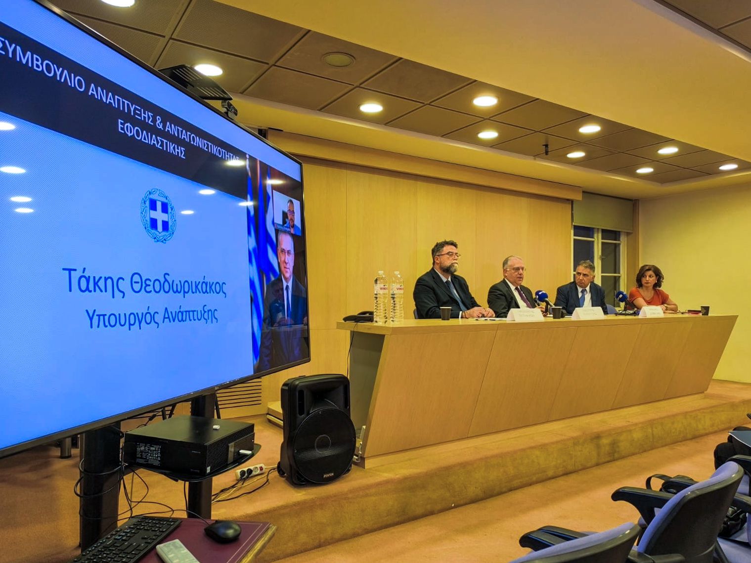 Πραγματοποιήθηκε χθες, 30 Οκτωβρίου, η πρώτη τακτική συνεδρίαση του νέου Εθνικού Συμβουλίου Ανάπτυξης και Ανταγωνιστικότητας Εφοδιαστικής, παρουσία του υπουργού Ανάπτυξης Τάκη Θεοδωρικάκου. Στην εκδήλωση παρόντες ήταν επίσης ο Υφυπουργός Μεταφορών, Βασίλης Οικονόμου, ο Πρόεδρος του Συμβουλίου, Θανάσης Ζηλιασκόπουλος, η Γενική Γραμματέας Βιομηχανίας, Βίκυ Λοϊζου, ο Γενικός Γραμματέας Εμπορίου, Σωτήρης Αναγνωστόπουλος, και η Γενική Γραμματέας Μεταφορών, Δέσποινα Παληαρούτα.